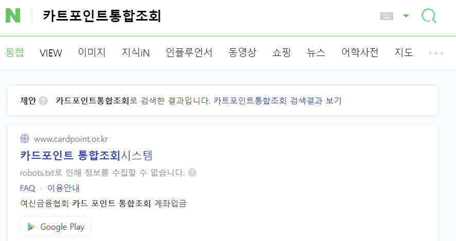 1. 먼저 네이버에서 카드포인트 종합조회 사이트를 검색 후 해당 사이트를 클릭합니다.